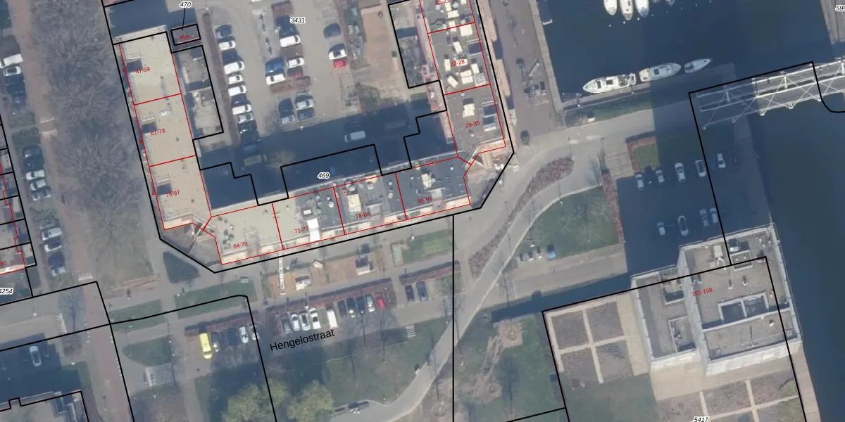 Hengelostraat 87 is gelegen op kadastraal perceel AMR04K469. Deze kadastrale aanduiding is uniek en wordt gebruikt door het Kadaster om eigendomsrechten en andere zakelijke rechten vast te leggen. Het perceel maakt onderdeel uit van de kadastrale gemeente Almere.
