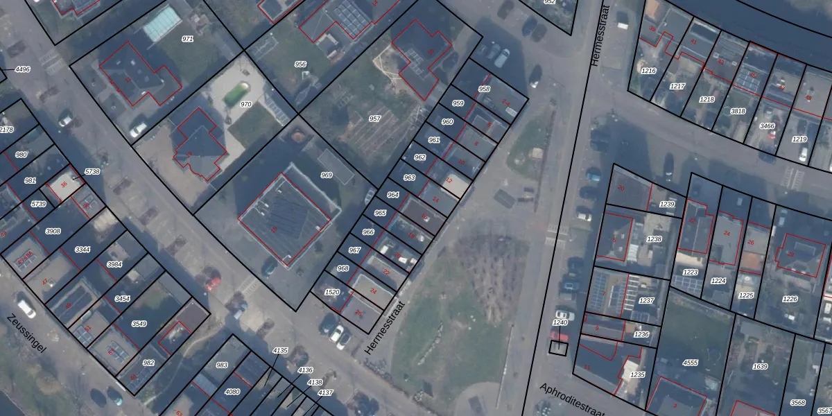 Het perceel waarop Hermesstraat 16 staat heeft een oppervlakte van 95 m². Dit is een klein perceel. De perceeloppervlakte wordt geregistreerd door het Kadaster. Gedetailleerde informatie over de maten van dit perceel kunt u vinden in het rapport Kadastrale kaart met maatvoering van Hermesstraat 16.