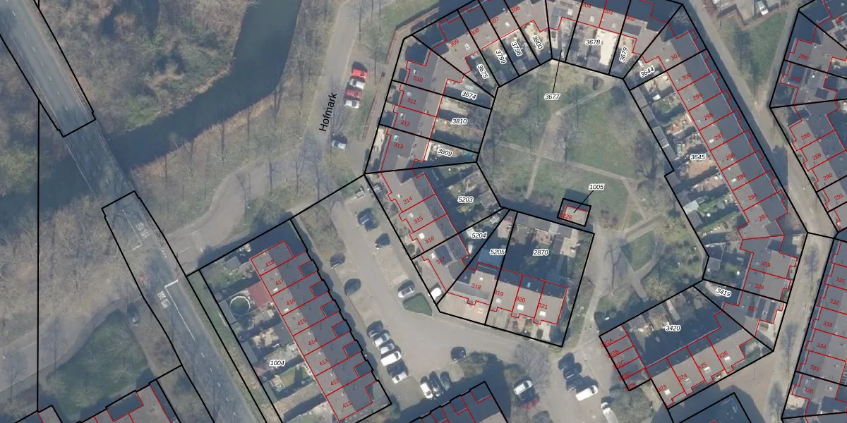 Het perceel waarop Hofmark 315 staat heeft een oppervlakte van 445 m². Dit is een groot perceel. De perceeloppervlakte wordt geregistreerd door het Kadaster. Gedetailleerde informatie over de maten van dit perceel kunt u vinden in het rapport Kadastrale kaart met maatvoering van Hofmark 315.