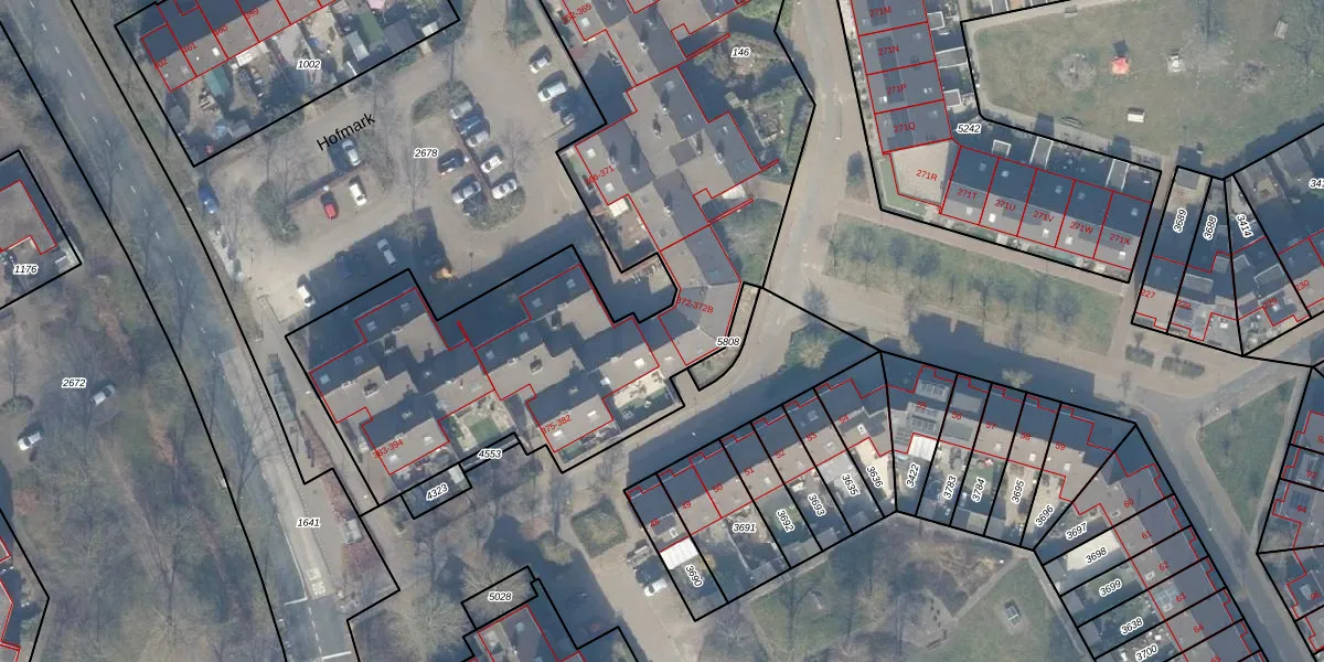 Het perceel waarop Hofmark 372-B staat heeft een oppervlakte van 3951 m². Dit is een zeer groot perceel. De perceeloppervlakte wordt geregistreerd door het Kadaster. Gedetailleerde informatie over de maten van dit perceel kunt u vinden in het rapport Kadastrale kaart met maatvoering van Hofmark 372-B.