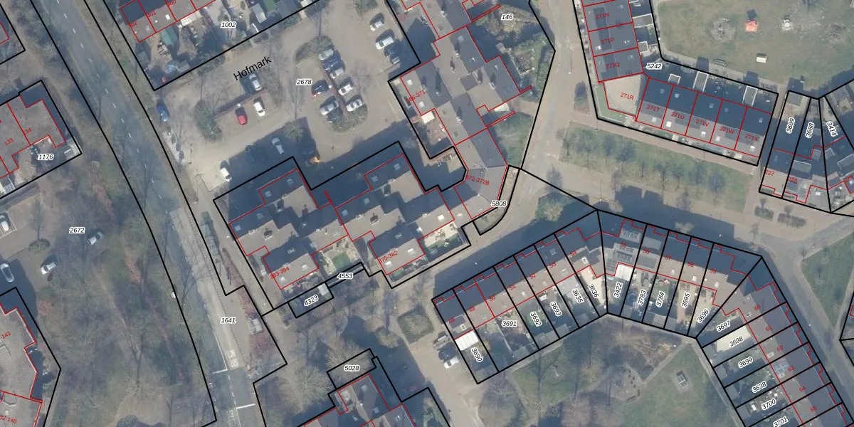 Het perceel waarop Hofmark 377 staat heeft een oppervlakte van 3951 m². Dit is een zeer groot perceel. De perceeloppervlakte wordt geregistreerd door het Kadaster. Gedetailleerde informatie over de maten van dit perceel kunt u vinden in het rapport Kadastrale kaart met maatvoering van Hofmark 377.