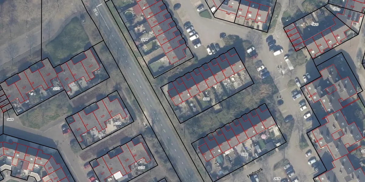 Het perceel waarop Hofmark 409 staat heeft een oppervlakte van 1039 m². Dit is een zeer groot perceel. De perceeloppervlakte wordt geregistreerd door het Kadaster. Gedetailleerde informatie over de maten van dit perceel kunt u vinden in het rapport Kadastrale kaart met maatvoering van Hofmark 409.