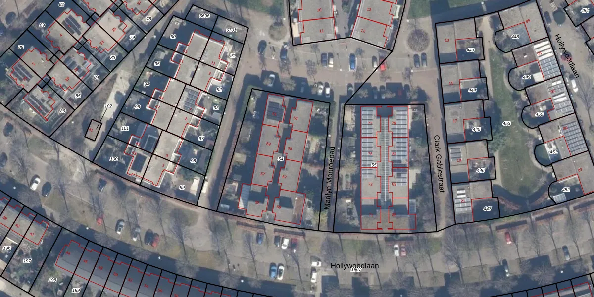 Hollywoodlaan 65 is gelegen op kadastraal perceel AMR04U54. Deze kadastrale aanduiding is uniek en wordt gebruikt door het Kadaster om eigendomsrechten en andere zakelijke rechten vast te leggen. Het perceel maakt onderdeel uit van de kadastrale gemeente Almere.