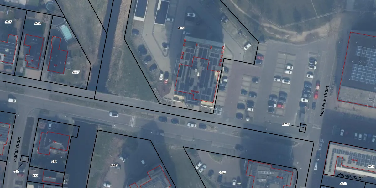 Het perceel waarop Homeruslaan 235 staat heeft een oppervlakte van 3997 m². Dit is een zeer groot perceel. De perceeloppervlakte wordt geregistreerd door het Kadaster. Gedetailleerde informatie over de maten van dit perceel kunt u vinden in het rapport Kadastrale kaart met maatvoering van Homeruslaan 235.