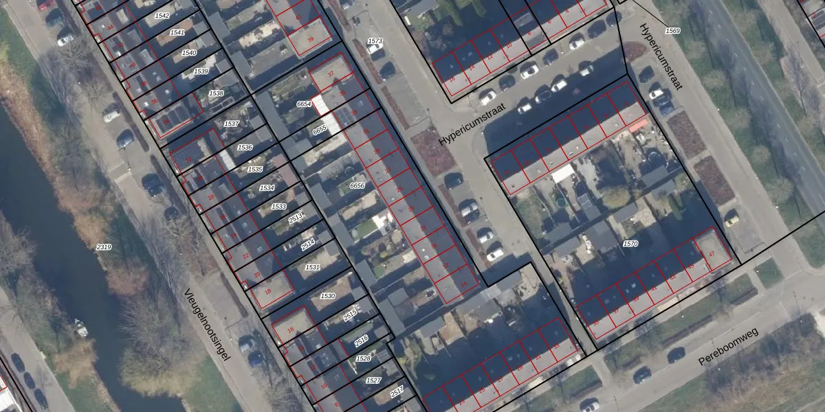 Het perceel waarop Hypericumstraat 23 staat heeft een oppervlakte van 2383 m². Dit is een zeer groot perceel. De perceeloppervlakte wordt geregistreerd door het Kadaster. Gedetailleerde informatie over de maten van dit perceel kunt u vinden in het rapport Kadastrale kaart met maatvoering van Hypericumstraat 23.
