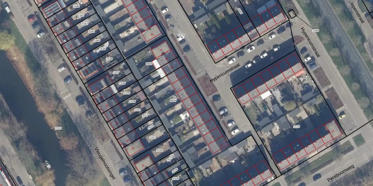 Het perceel waarop Hypericumstraat 27 staat heeft een oppervlakte van 2383 m². Dit is een zeer groot perceel. De perceeloppervlakte wordt geregistreerd door het Kadaster. Gedetailleerde informatie over de maten van dit perceel kunt u vinden in het rapport Kadastrale kaart met maatvoering van Hypericumstraat 27.