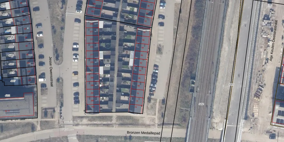 Het adres ligt op het perceel AMR04-W-3440, dat zich in de kadastrale gemeente Almere bevindt. De gemiddelde perceelgrootte in Almere is 3328,15 m². Dit perceel is kleiner: de perceeloppervlakte bedraagt 2830 m². Het grootste perceel in de kadastrale gemeente is 32,12 km². Het kleinste perceel heeft een oppervlakte van 0 m². Op het perceel zijn 23 adressen aanwezig. In de Basisregistratie Kadaster (BRK) werden de grenzen van het perceel geregistreerd op 07-01-2022.