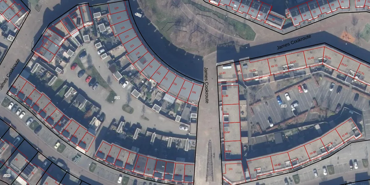 Het perceel waarop James Cookroute 107 staat heeft een oppervlakte van 6597 m². Dit is een zeer groot perceel. De perceeloppervlakte wordt geregistreerd door het Kadaster. Gedetailleerde informatie over de maten van dit perceel kunt u vinden in het rapport Kadastrale kaart met maatvoering van James Cookroute 107.