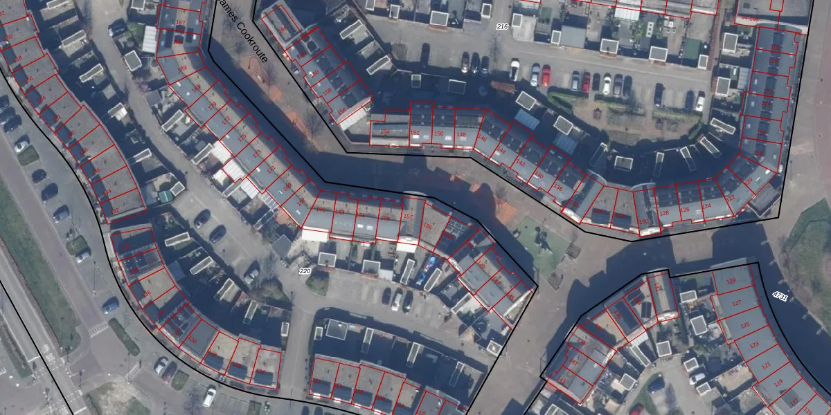 James Cookroute 157 is gelegen op kadastraal perceel AMR04W220. Deze kadastrale aanduiding is uniek en wordt gebruikt door het Kadaster om eigendomsrechten en andere zakelijke rechten vast te leggen. Het perceel maakt onderdeel uit van de kadastrale gemeente Almere.