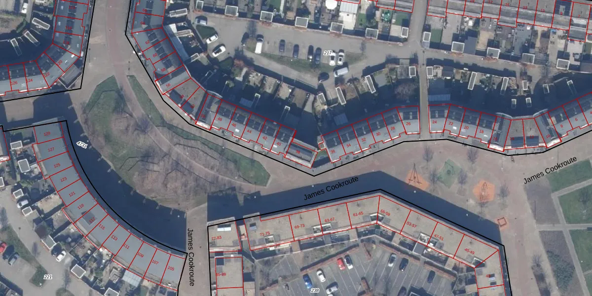 Het perceel waarop James Cookroute 38 staat heeft een oppervlakte van 1,0 ha. Dit is een zeer groot perceel. De perceeloppervlakte wordt geregistreerd door het Kadaster. Gedetailleerde informatie over de maten van dit perceel kunt u vinden in het rapport Kadastrale kaart met maatvoering van James Cookroute 38.