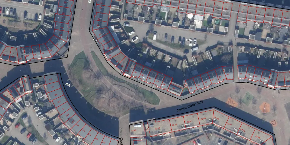 James Cookroute 46 is gelegen op kadastraal perceel AMR04W217. Deze kadastrale aanduiding is uniek en wordt gebruikt door het Kadaster om eigendomsrechten en andere zakelijke rechten vast te leggen. Het perceel maakt onderdeel uit van de kadastrale gemeente Almere.