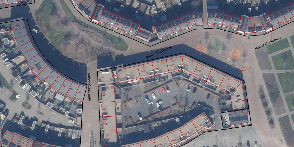James Cookroute 73 is gelegen op kadastraal perceel AMR04W238. Deze kadastrale aanduiding is uniek en wordt gebruikt door het Kadaster om eigendomsrechten en andere zakelijke rechten vast te leggen. Het perceel maakt onderdeel uit van de kadastrale gemeente Almere.