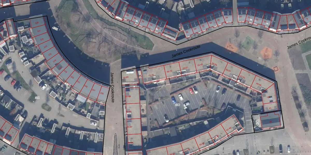 Het perceel waarop James Cookroute 75 staat heeft een oppervlakte van 5440 m². Dit is een zeer groot perceel. De perceeloppervlakte wordt geregistreerd door het Kadaster. Gedetailleerde informatie over de maten van dit perceel kunt u vinden in het rapport Kadastrale kaart met maatvoering van James Cookroute 75.