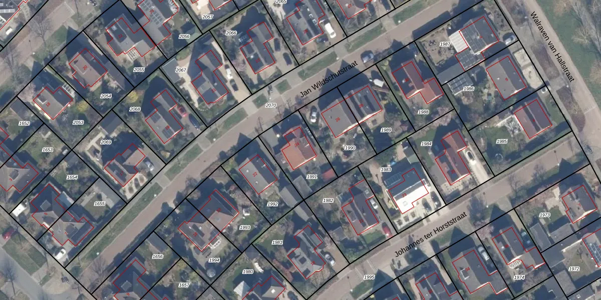 Het perceel waarop Jan Wildschutstraat 24 staat heeft een oppervlakte van 389 m². Dit is een groot perceel. De perceeloppervlakte wordt geregistreerd door het Kadaster. Gedetailleerde informatie over de maten van dit perceel kunt u vinden in het rapport Kadastrale kaart met maatvoering van Jan Wildschutstraat 24.