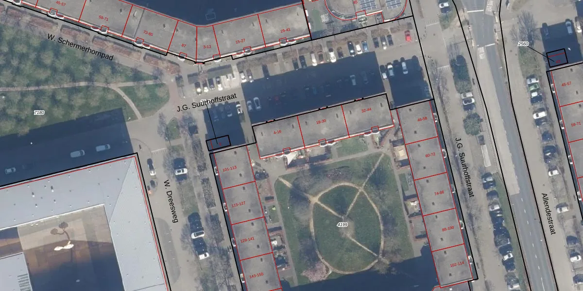 Het perceel waarop J.G. Suurhoffstraat 16 staat heeft een oppervlakte van 6382 m². Dit is een zeer groot perceel. De perceeloppervlakte wordt geregistreerd door het Kadaster. Gedetailleerde informatie over de maten van dit perceel kunt u vinden in het rapport Kadastrale kaart met maatvoering van J.G. Suurhoffstraat 16.