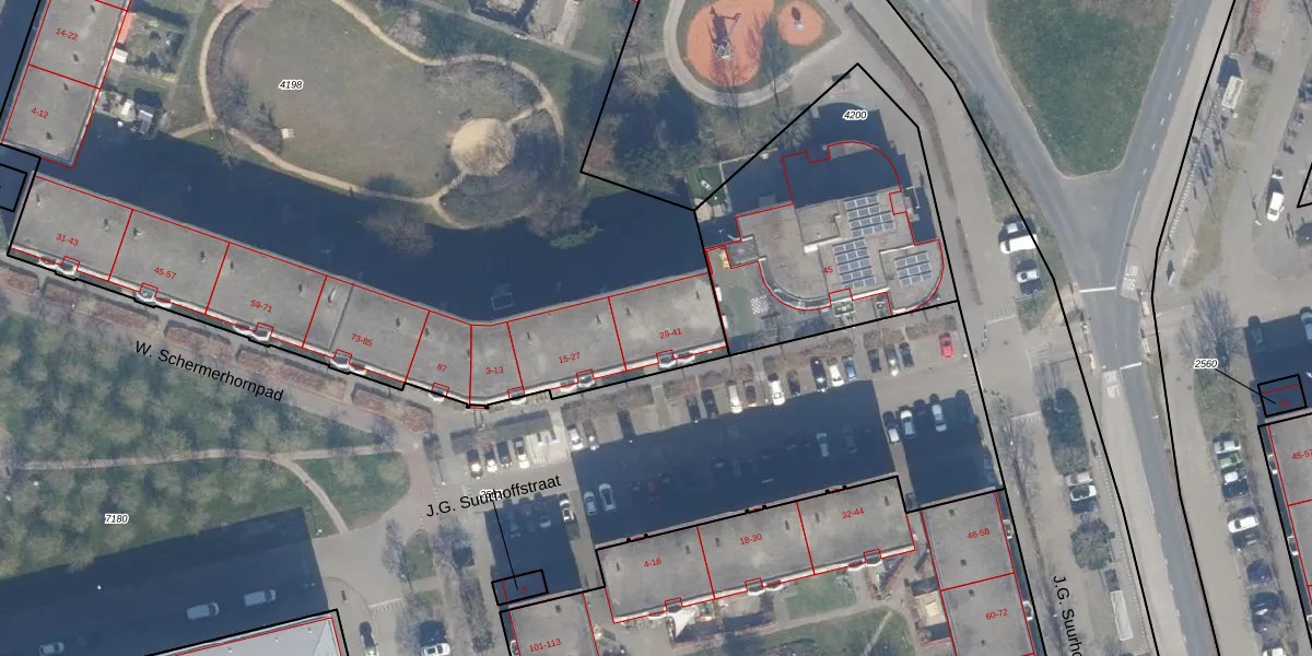 Het perceel waarop J.G. Suurhoffstraat 31 staat heeft een oppervlakte van 7463 m². Dit is een zeer groot perceel. De perceeloppervlakte wordt geregistreerd door het Kadaster. Gedetailleerde informatie over de maten van dit perceel kunt u vinden in het rapport Kadastrale kaart met maatvoering van J.G. Suurhoffstraat 31.