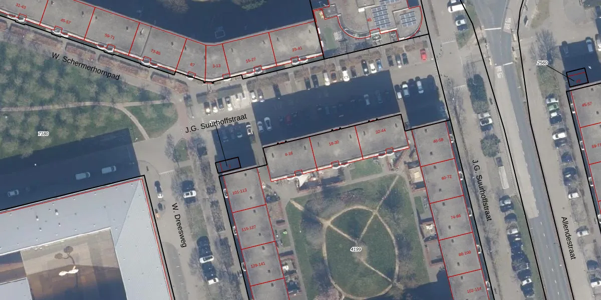 Het perceel waarop J.G. Suurhoffstraat 4 staat heeft een oppervlakte van 6382 m². Dit is een zeer groot perceel. De perceeloppervlakte wordt geregistreerd door het Kadaster. Gedetailleerde informatie over de maten van dit perceel kunt u vinden in het rapport Kadastrale kaart met maatvoering van J.G. Suurhoffstraat 4.