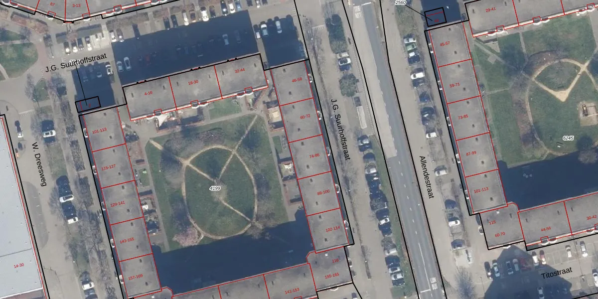 Het perceel waarop J.G. Suurhoffstraat 84 staat heeft een oppervlakte van 6382 m². Dit is een zeer groot perceel. De perceeloppervlakte wordt geregistreerd door het Kadaster. Gedetailleerde informatie over de maten van dit perceel kunt u vinden in het rapport Kadastrale kaart met maatvoering van J.G. Suurhoffstraat 84.
