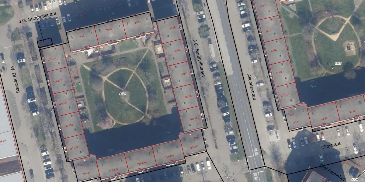 Het perceel waarop J.G. Suurhoffstraat 94 staat heeft een oppervlakte van 6382 m². Dit is een zeer groot perceel. De perceeloppervlakte wordt geregistreerd door het Kadaster. Gedetailleerde informatie over de maten van dit perceel kunt u vinden in het rapport Kadastrale kaart met maatvoering van J.G. Suurhoffstraat 94.