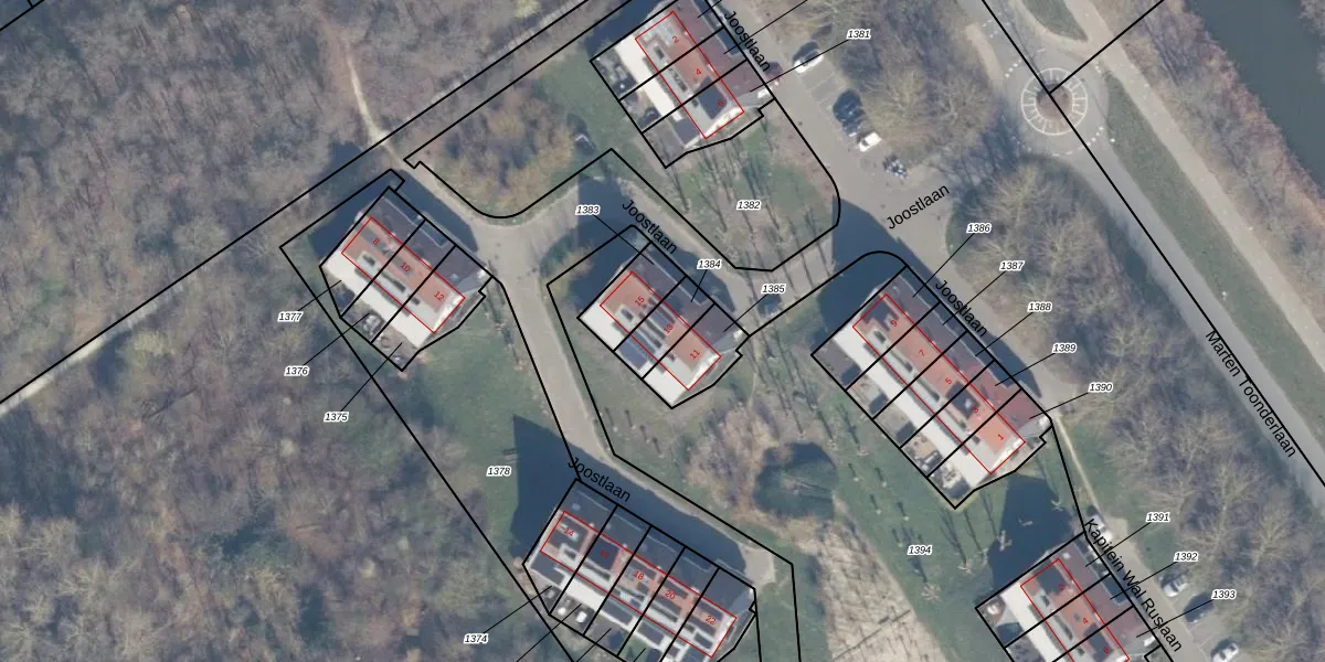 Het perceel waarop Joostlaan 13 staat heeft een oppervlakte van 96 m². Dit is een klein perceel. De perceeloppervlakte wordt geregistreerd door het Kadaster. Gedetailleerde informatie over de maten van dit perceel kunt u vinden in het rapport Kadastrale kaart met maatvoering van Joostlaan 13.