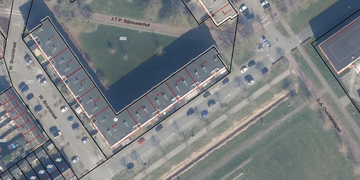Het perceel waarop J.T.P. Bijhouwerhof 117 staat heeft een oppervlakte van 2621 m². Dit is een zeer groot perceel. De perceeloppervlakte wordt geregistreerd door het Kadaster. Gedetailleerde informatie over de maten van dit perceel kunt u vinden in het rapport Kadastrale kaart met maatvoering van J.T.P. Bijhouwerhof 117.