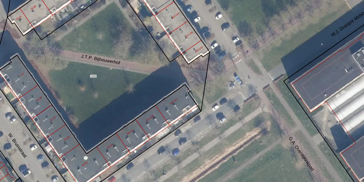 Het perceel waarop J.T.P. Bijhouwerhof 141 staat heeft een oppervlakte van 2621 m². Dit is een zeer groot perceel. De perceeloppervlakte wordt geregistreerd door het Kadaster. Gedetailleerde informatie over de maten van dit perceel kunt u vinden in het rapport Kadastrale kaart met maatvoering van J.T.P. Bijhouwerhof 141.