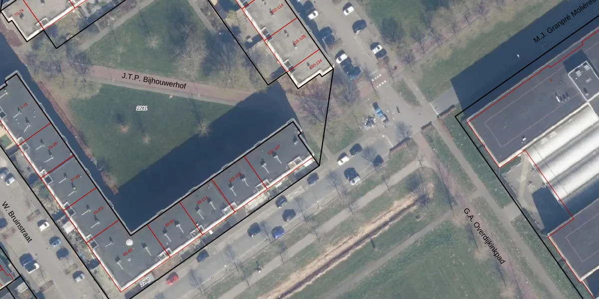 Het perceel waarop J.T.P. Bijhouwerhof 145 staat heeft een oppervlakte van 2621 m². Dit is een zeer groot perceel. De perceeloppervlakte wordt geregistreerd door het Kadaster. Gedetailleerde informatie over de maten van dit perceel kunt u vinden in het rapport Kadastrale kaart met maatvoering van J.T.P. Bijhouwerhof 145.