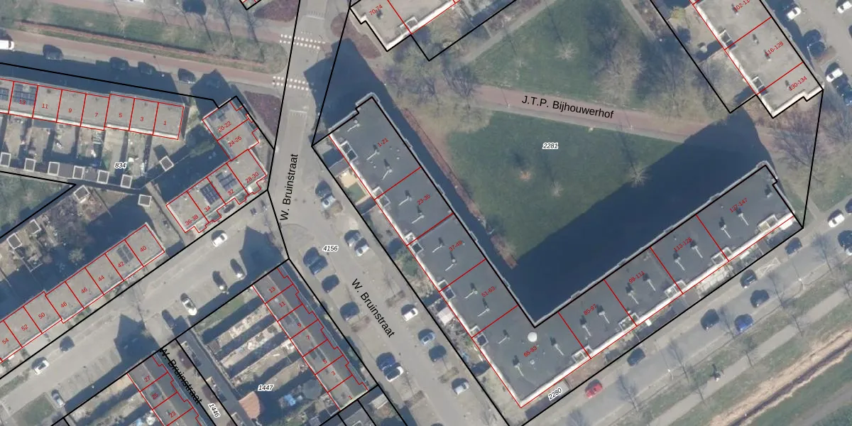 Het perceel waarop J.T.P. Bijhouwerhof 25 staat heeft een oppervlakte van 2621 m². Dit is een zeer groot perceel. De perceeloppervlakte wordt geregistreerd door het Kadaster. Gedetailleerde informatie over de maten van dit perceel kunt u vinden in het rapport Kadastrale kaart met maatvoering van J.T.P. Bijhouwerhof 25.