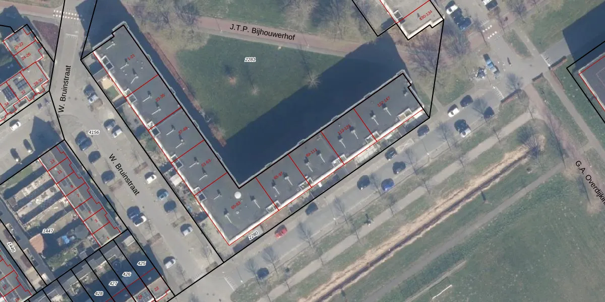 Het perceel waarop J.T.P. Bijhouwerhof 99 staat heeft een oppervlakte van 2621 m². Dit is een zeer groot perceel. De perceeloppervlakte wordt geregistreerd door het Kadaster. Gedetailleerde informatie over de maten van dit perceel kunt u vinden in het rapport Kadastrale kaart met maatvoering van J.T.P. Bijhouwerhof 99.