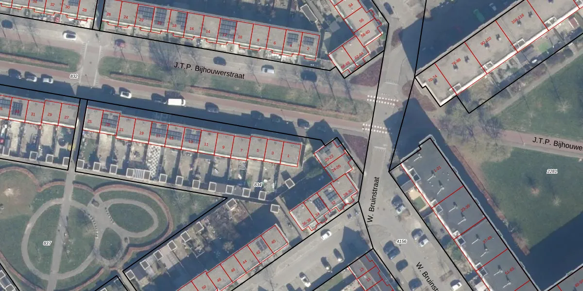 Het perceel waarop J.T.P. Bijhouwerstraat 1 staat heeft een oppervlakte van 3931 m². Dit is een zeer groot perceel. De perceeloppervlakte wordt geregistreerd door het Kadaster. Gedetailleerde informatie over de maten van dit perceel kunt u vinden in het rapport Kadastrale kaart met maatvoering van J.T.P. Bijhouwerstraat 1.