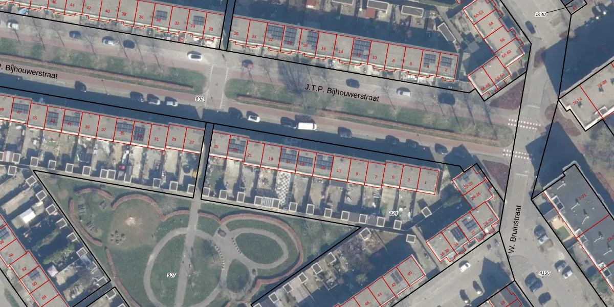 Het perceel waarop J.T.P. Bijhouwerstraat 15 staat heeft een oppervlakte van 3931 m². Dit is een zeer groot perceel. De perceeloppervlakte wordt geregistreerd door het Kadaster. Gedetailleerde informatie over de maten van dit perceel kunt u vinden in het rapport Kadastrale kaart met maatvoering van J.T.P. Bijhouwerstraat 15.
