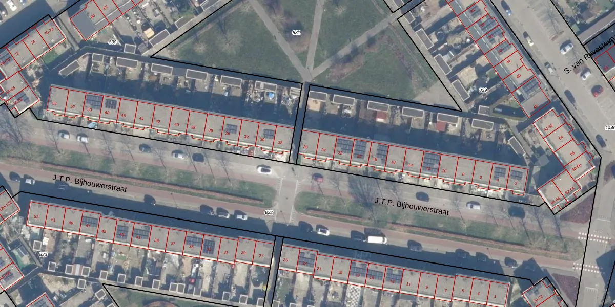 Het perceel waarop J.T.P. Bijhouwerstraat 26 staat heeft een oppervlakte van 3926 m². Dit is een zeer groot perceel. De perceeloppervlakte wordt geregistreerd door het Kadaster. Gedetailleerde informatie over de maten van dit perceel kunt u vinden in het rapport Kadastrale kaart met maatvoering van J.T.P. Bijhouwerstraat 26.