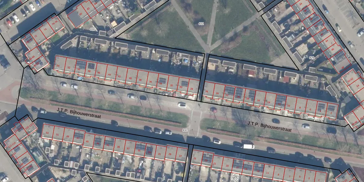 Het perceel waarop J.T.P. Bijhouwerstraat 30 staat heeft een oppervlakte van 4087 m². Dit is een zeer groot perceel. De perceeloppervlakte wordt geregistreerd door het Kadaster. Gedetailleerde informatie over de maten van dit perceel kunt u vinden in het rapport Kadastrale kaart met maatvoering van J.T.P. Bijhouwerstraat 30.