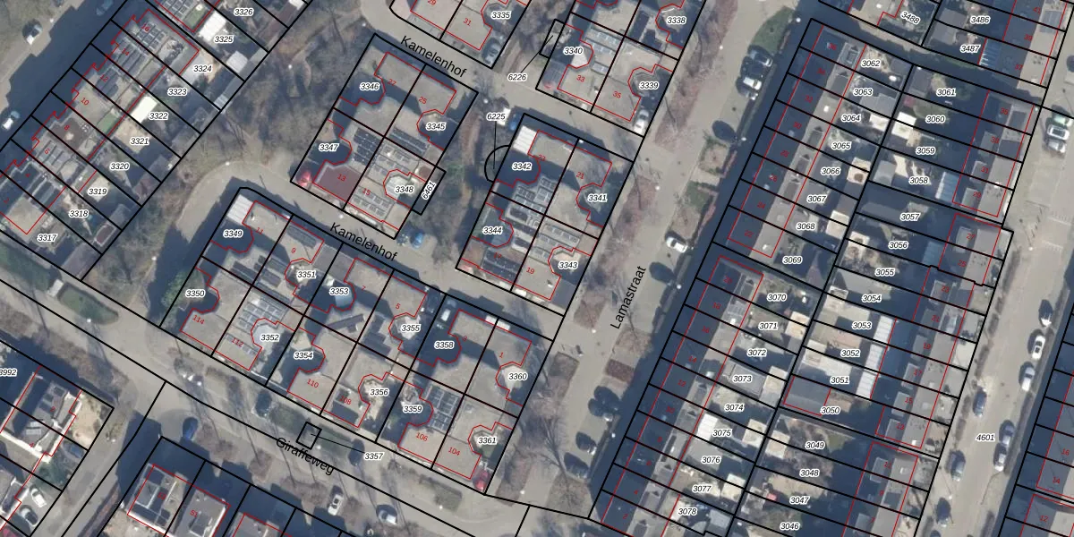 Het perceel waarop Kamelenhof 19 staat heeft een oppervlakte van 174 m². Dit is een middelgroot perceel. De perceeloppervlakte wordt geregistreerd door het Kadaster. Gedetailleerde informatie over de maten van dit perceel kunt u vinden in het rapport Kadastrale kaart met maatvoering van Kamelenhof 19.