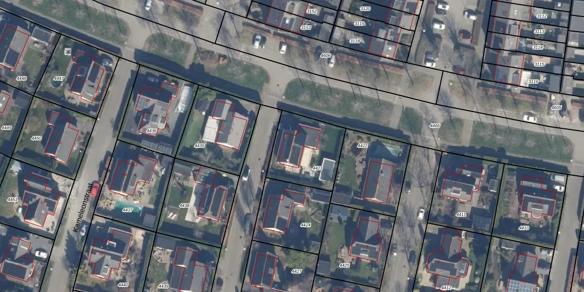 Het perceel waarop Kameleonstraat 1 staat heeft een oppervlakte van 529 m². Dit is een groot perceel. De perceeloppervlakte wordt geregistreerd door het Kadaster. Gedetailleerde informatie over de maten van dit perceel kunt u vinden in het rapport Kadastrale kaart met maatvoering van Kameleonstraat 1.