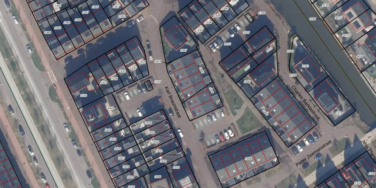 Het perceel waarop Karl Braunstraat 21 staat heeft een oppervlakte van 402 m². Dit is een groot perceel. De perceeloppervlakte wordt geregistreerd door het Kadaster. Gedetailleerde informatie over de maten van dit perceel kunt u vinden in het rapport Kadastrale kaart met maatvoering van Karl Braunstraat 21.