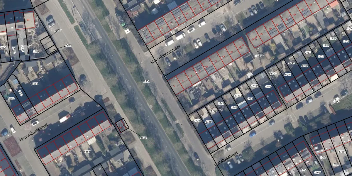 Het perceel waarop Kerseboomstraat 2 staat heeft een oppervlakte van 2787 m². Dit is een zeer groot perceel. De perceeloppervlakte wordt geregistreerd door het Kadaster. Gedetailleerde informatie over de maten van dit perceel kunt u vinden in het rapport Kadastrale kaart met maatvoering van Kerseboomstraat 2.