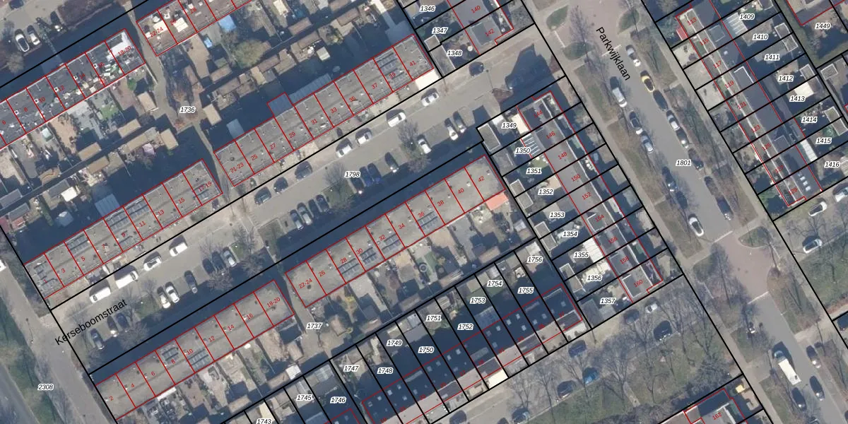Het perceel waarop Kerseboomstraat 36 staat heeft een oppervlakte van 2787 m². Dit is een zeer groot perceel. De perceeloppervlakte wordt geregistreerd door het Kadaster. Gedetailleerde informatie over de maten van dit perceel kunt u vinden in het rapport Kadastrale kaart met maatvoering van Kerseboomstraat 36.
