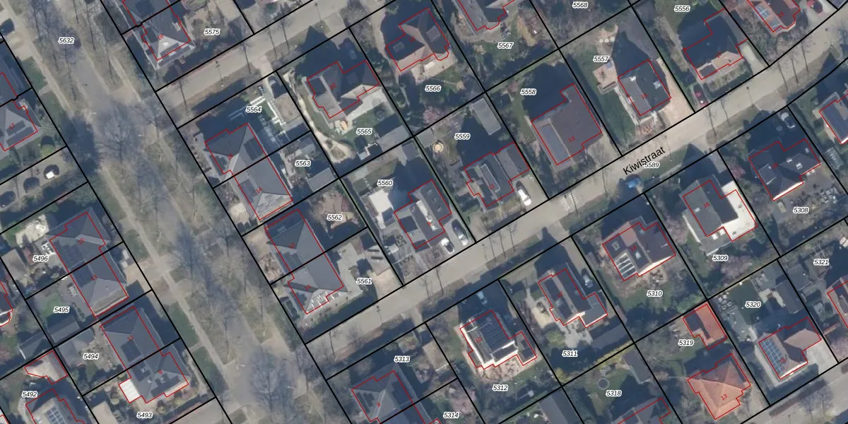 Het perceel waarop Kiwistraat 9 staat heeft een oppervlakte van 588 m². Dit is een groot perceel. De perceeloppervlakte wordt geregistreerd door het Kadaster. Gedetailleerde informatie over de maten van dit perceel kunt u vinden in het rapport Kadastrale kaart met maatvoering van Kiwistraat 9.