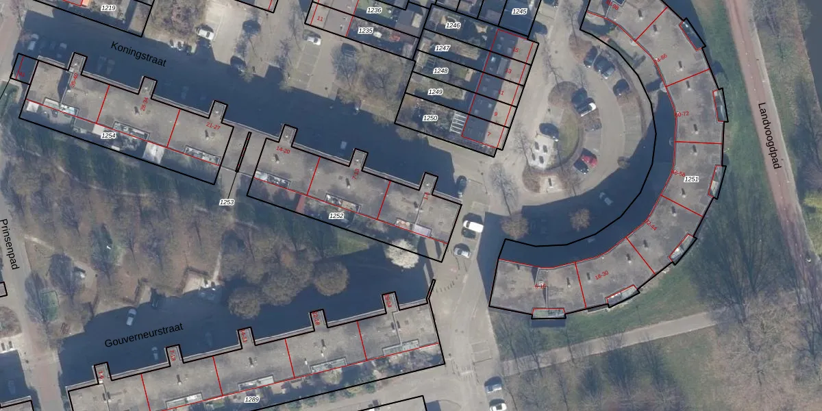 Het perceel waarop Koningstraat 1 staat heeft een oppervlakte van 786 m². Dit is een groot perceel. De perceeloppervlakte wordt geregistreerd door het Kadaster. Gedetailleerde informatie over de maten van dit perceel kunt u vinden in het rapport Kadastrale kaart met maatvoering van Koningstraat 1.