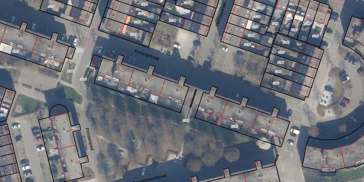 Het perceel waarop Koningstraat 22 staat heeft een oppervlakte van 788 m². Dit is een groot perceel. De perceeloppervlakte wordt geregistreerd door het Kadaster. Gedetailleerde informatie over de maten van dit perceel kunt u vinden in het rapport Kadastrale kaart met maatvoering van Koningstraat 22.