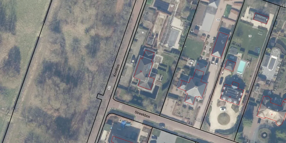 Het perceel waarop Kooibos 13 staat heeft een oppervlakte van 3474 m². Dit is een zeer groot perceel. De perceeloppervlakte wordt geregistreerd door het Kadaster. Gedetailleerde informatie over de maten van dit perceel kunt u vinden in het rapport Kadastrale kaart met maatvoering van Kooibos 13.