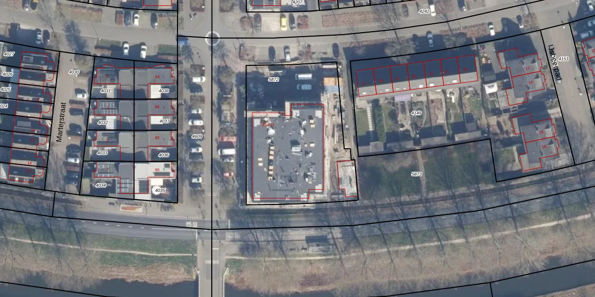 Het perceel waarop het adres ligt is AMR04-N-5872. De afkorting 'AMR04' staat voor kadastrale gemeente Almere. Het perceel is kleiner dan gemiddeld in Almere. Het perceel is 1577 m² groot, terwijl het gemiddelde ligt op 3328,15 m². Het grootste perceel in de kadastrale gemeente is 32,12 km². Het kleinste perceel heeft een oppervlakte van 0 m². Op het perceel liggen in totaal 24 adressen. De huidige grenzen van het perceel zijn digitaal in de Basisregistratie Kadaster (BRK) geregistreerd op 08-12-2003.