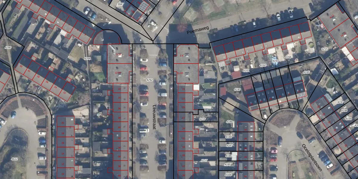 Het perceel waarop Leeuwstraat 21 staat heeft een oppervlakte van 4589 m². Dit is een zeer groot perceel. De perceeloppervlakte wordt geregistreerd door het Kadaster. Gedetailleerde informatie over de maten van dit perceel kunt u vinden in het rapport Kadastrale kaart met maatvoering van Leeuwstraat 21.