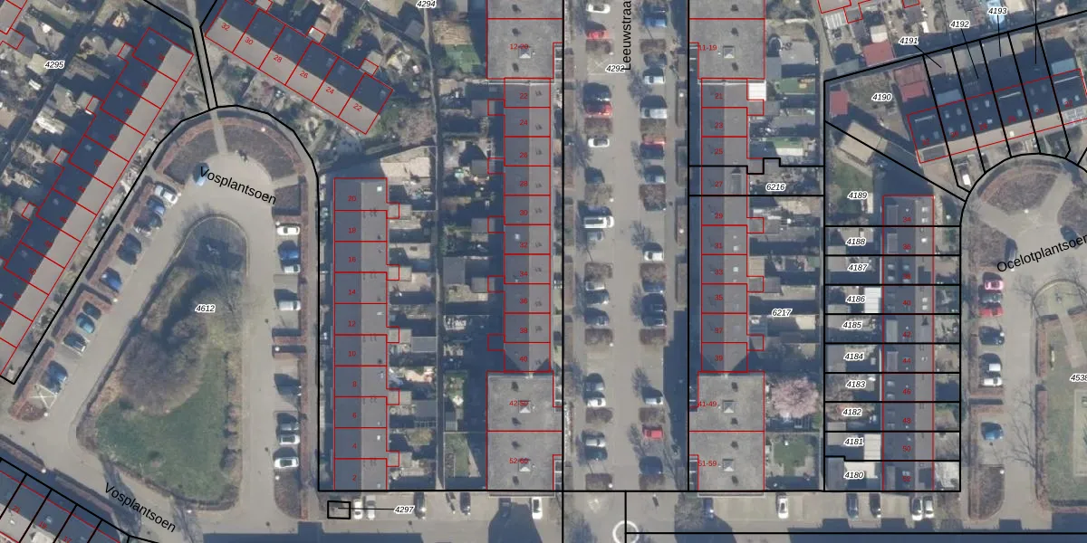 Het perceel waarop Leeuwstraat 34 staat heeft een oppervlakte van 6282 m². Dit is een zeer groot perceel. De perceeloppervlakte wordt geregistreerd door het Kadaster. Gedetailleerde informatie over de maten van dit perceel kunt u vinden in het rapport Kadastrale kaart met maatvoering van Leeuwstraat 34.