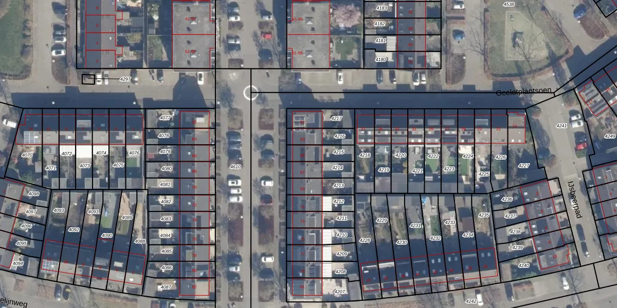 Het perceel waarop het adres ligt is AMR04-N-4215. De afkorting 'AMR04' staat voor kadastrale gemeente Almere. Het perceel is kleiner dan gemiddeld in Almere. Het perceel is 120 m² groot, terwijl het gemiddelde ligt op 3327,62 m². Het grootste perceel in de kadastrale gemeente is 32,12 km². Het kleinste perceel heeft een oppervlakte van 0 m². Dit is het enige adres dat aanwezig is op het perceel. De laatste wijziging in het de Basisregistratie Kadaster (BRK) was op 20-08-1997.