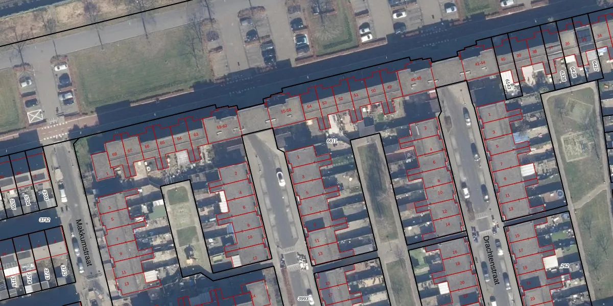 Het perceel waarop het adres ligt is AMR04-K-6811. De afkorting 'AMR04' staat voor kadastrale gemeente Almere. Het perceel is met 7740 m² relatief groot. Het gemiddelde ligt in de kadastrale gemeente Almere op 3329,36 m². De grootste perceeloppervlakte in de kadastrale gemeente is 32,12 km². De kleinste oppervlakte bedraagt 0 m². Er zijn 72 adressen aanwezig op het perceel. De huidige grenzen van het perceel zijn digitaal in de Basisregistratie Kadaster (BRK) geregistreerd op 17-04-2013.