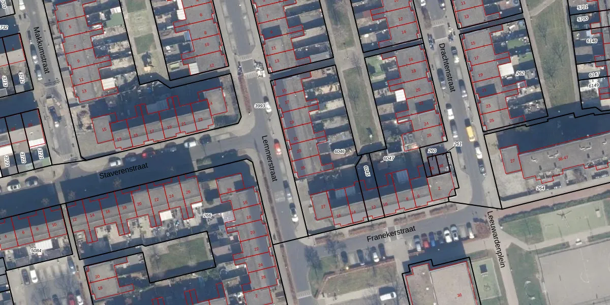 Het perceel waarop Lemmerstraat 23 staat heeft een oppervlakte van 1121 m². Dit is een zeer groot perceel. De perceeloppervlakte wordt geregistreerd door het Kadaster. Gedetailleerde informatie over de maten van dit perceel kunt u vinden in het rapport Kadastrale kaart met maatvoering van Lemmerstraat 23.