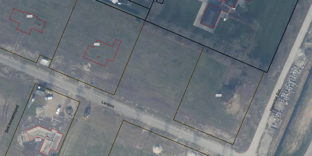Het perceel waarop Liesbos 21 staat heeft een oppervlakte van 34,4 ha. Dit is een zeer groot perceel. De perceeloppervlakte wordt geregistreerd door het Kadaster. Gedetailleerde informatie over de maten van dit perceel kunt u vinden in het rapport Kadastrale kaart met maatvoering van Liesbos 21.