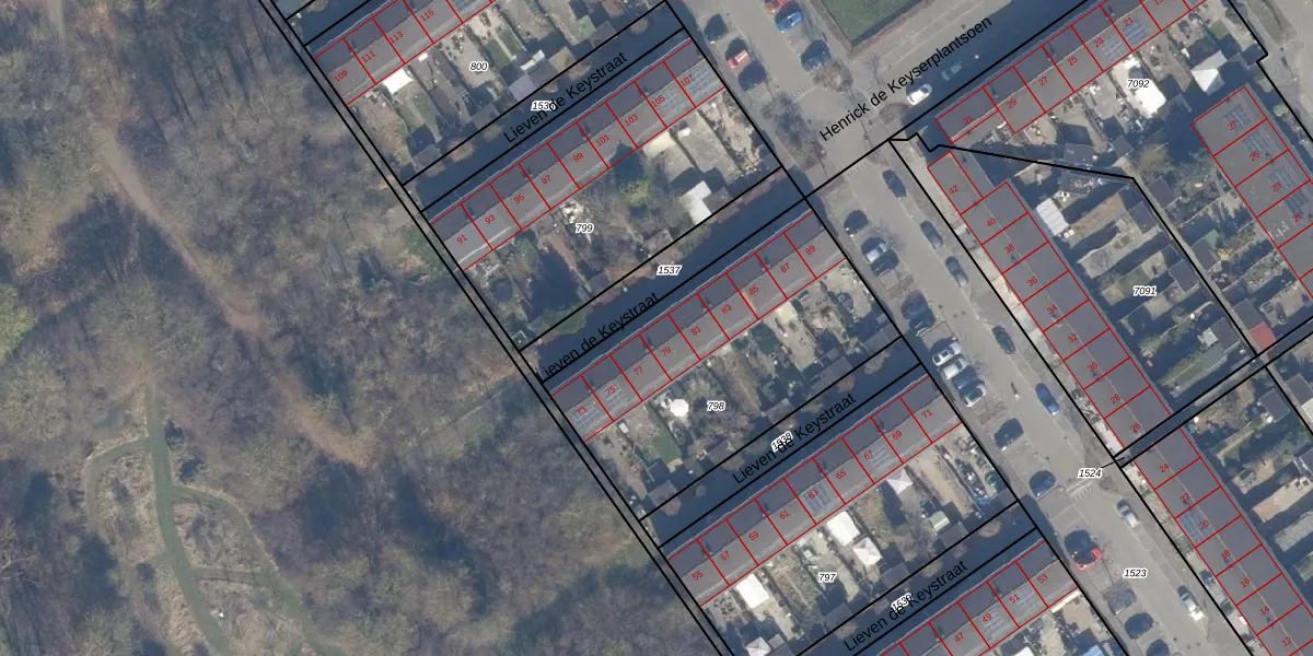 Het perceel waarop Lieven de Keystraat 79 staat heeft een oppervlakte van 1261 m². Dit is een zeer groot perceel. De perceeloppervlakte wordt geregistreerd door het Kadaster. Gedetailleerde informatie over de maten van dit perceel kunt u vinden in het rapport Kadastrale kaart met maatvoering van Lieven de Keystraat 79.